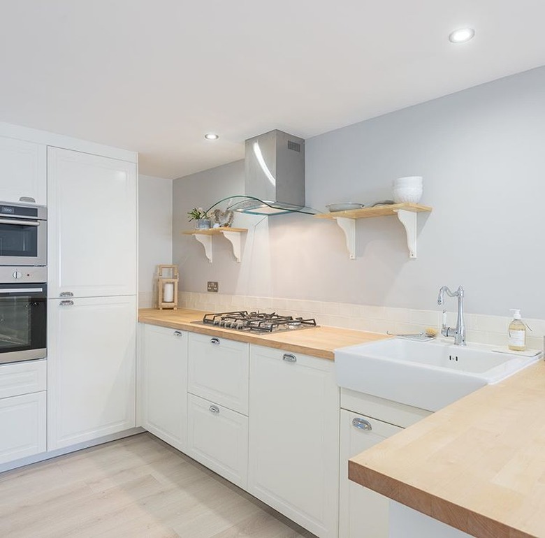 For a chic and classic look, consider pairing cream hardwood flooring with white cabinets and light wood countertops. This space also incorporates open shelving in the same tones.