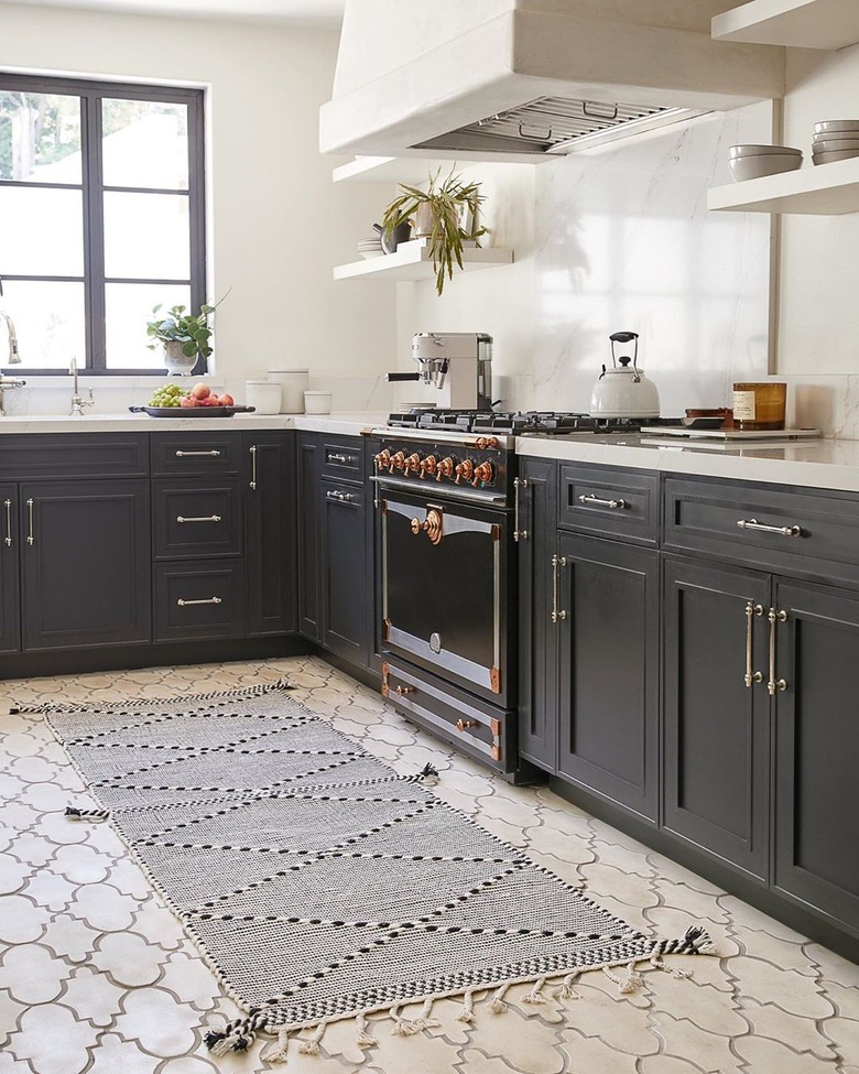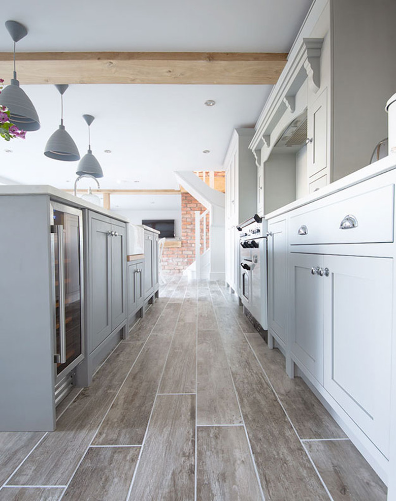 Not a fan of darker kitchen floors? Lighten things up with this style, which mirrors the look of antique stone. You can set it up in a uniform rectangular fashion or play with differing tile sizes for a stylish look.