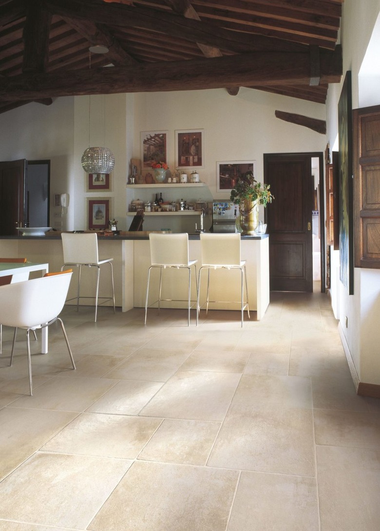 If you're into the idea of cream kitchen flooring, you can definitely find porcelain tile options out there. Use mixed sizes to create a subtle pattern or stick to the same measurements for an even cleaner look.