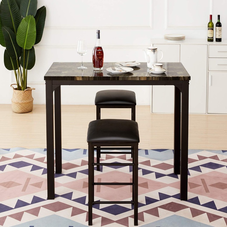 When all else fails, you can always count on a petite table set to pull kitchen island duty at home. A swanky pub table set with a faux marble top and stools transitions from a food prep zone to a bonafide breakfast bar in no time.