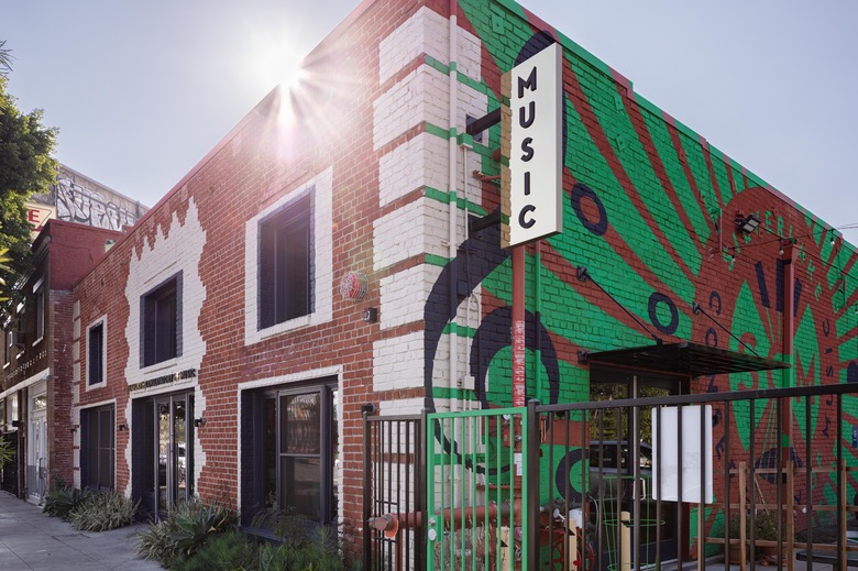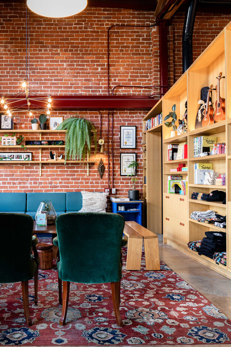 TA: One of my favorite spaces you designed is the Silverlake Conservatory of Music on Hollywood Boulevard in Los Feliz. It feels warm and intimate in the "living room" waiting area with the exposed brick walls and soft lighting, while anyone who walks into the studio areas and performance space is completely energized by the towering ceiling and skylights, your color blocking, and the use of that reflective gold-striped-patterned structure that is a total wow moment.