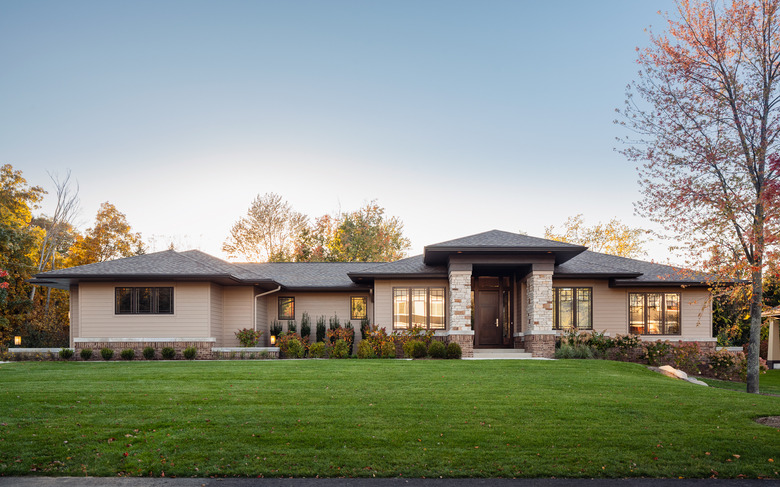 According to Realtor.com, ranch houses were "meant to blur the lines between indoor and out the way formal homes hadn't before." Around the 1930s, these houses started to gain more popularity; California architect Cliff May is usually credit as establishing the midcentury modern ranch home aesthetic around this time. According to Angie's List, they really took off around the 1950s to 1960s. Ranch homes are normally one story with low roofs and not a lot of exterior ornamentation. They normally don't include elements like porches that other homes might incorporate. Craftsman houses already feature overhanging eaves and pared-down architectural elements so it makes sense that the two would go hand in hand.
