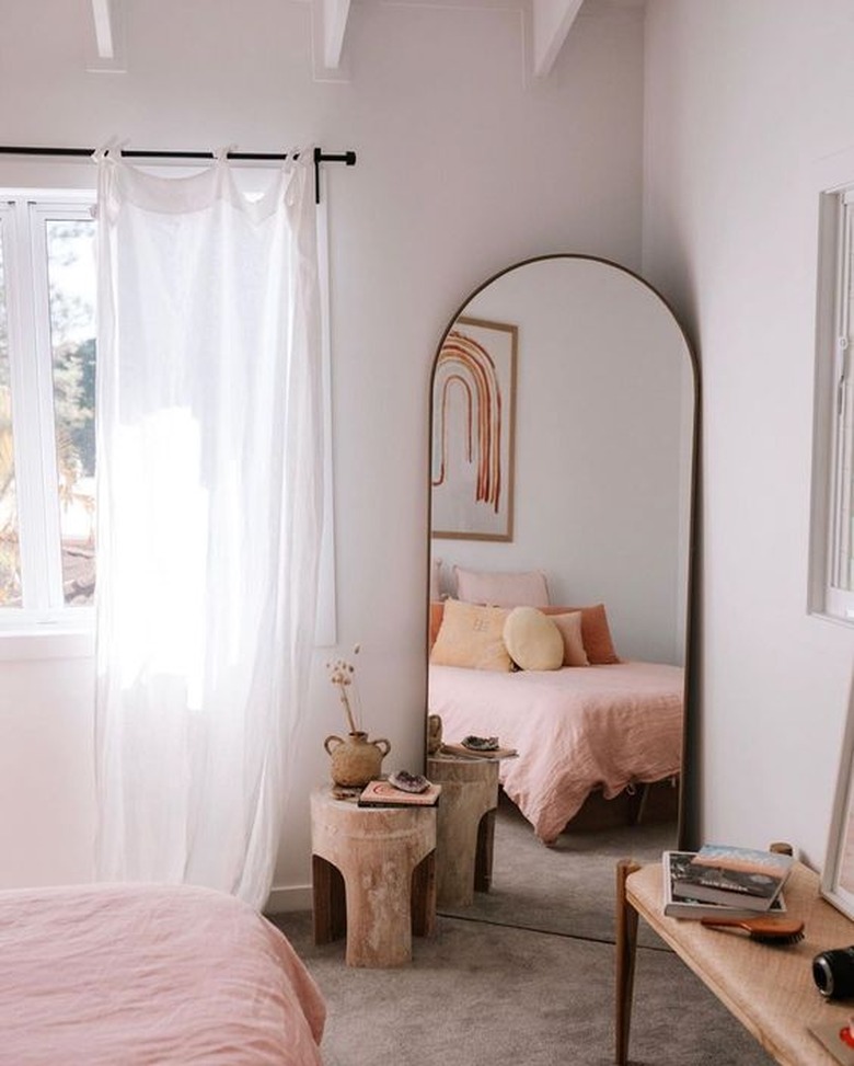 An important part of the boho beach look is free-flowing materials and light fabrics. Think summer dresses flowing in a light breeze. This bedroom by Elsa features relaxed white curtains, creating a laid-back vibe that is perfectly matched to the wooden side table and soft pastel bedding.