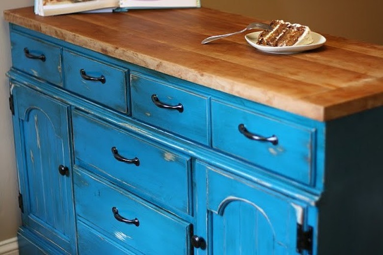 If you haven't seen this design trend yet, then welcome to an affordable and unique answer to your kitchen storage needs. This blue DIY kitchen island by Derek and Angel of Sweet November was a cheap Craiglist find, and we applaud how they then applied their own eye-catching distressed look.