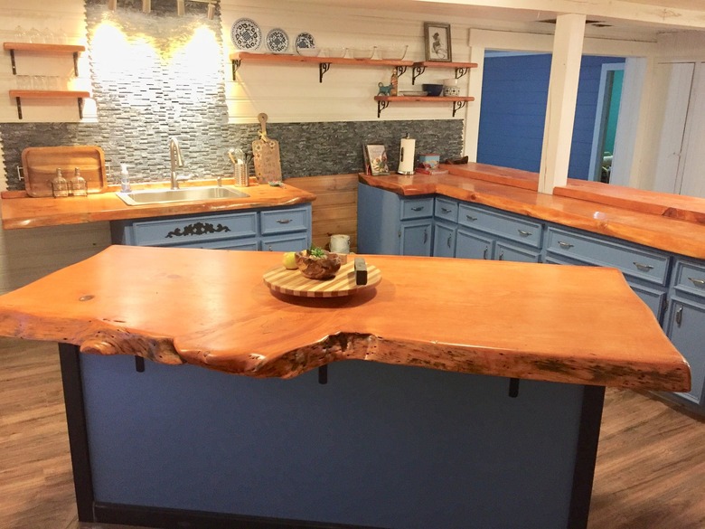 1) Use a live-edge wood slab as a countertop.