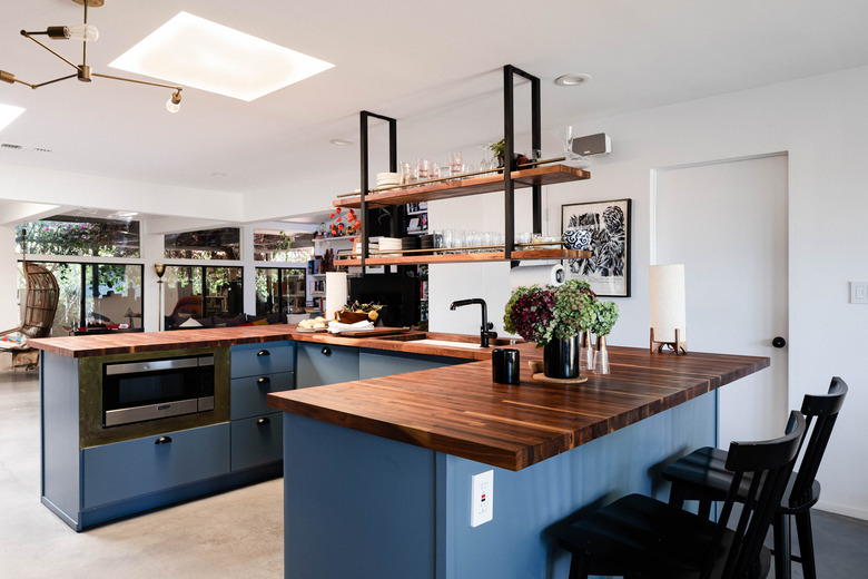 Use caution when choosing your under-cabinet lighting. As Angie's List points out, halogen bulbs and other bulbs that get hot work best under cabinets where you don't store food. When illuminating your counters, remember the island too. Kitchen islands are another common work area most often illuminated by pendant lights or another type of suspension lighting, which should generally hang about 30 to 36 inches above the island. Pendants also work well over sinks and stoves if you have the space to hang them.