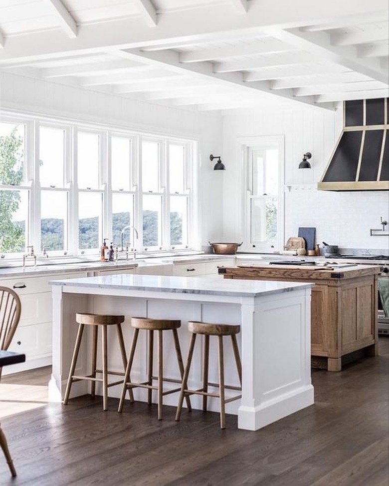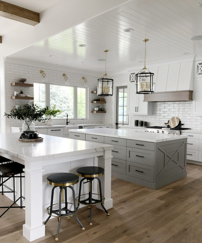 While contrasting islands can look brilliant, matching ones will certainly make more of a design statement. The dual wooden kitchen islands in this farmhouse interior incorporate slightly different fronts, but both work with the marble countertops and woodworked diamond features.