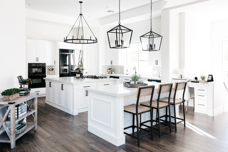Even a slightly awkward space can work with double kitchen islands; in fact, they may just help to create more of a structure. This bright and modern kitchen by The Tom Kat Studio includes dual islands with white quartz countertops and matte black fixtures that perfectly break up the space.