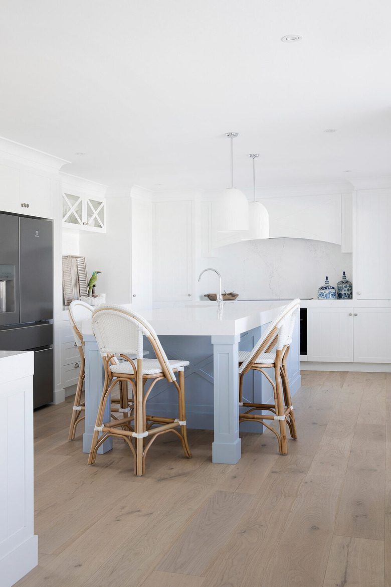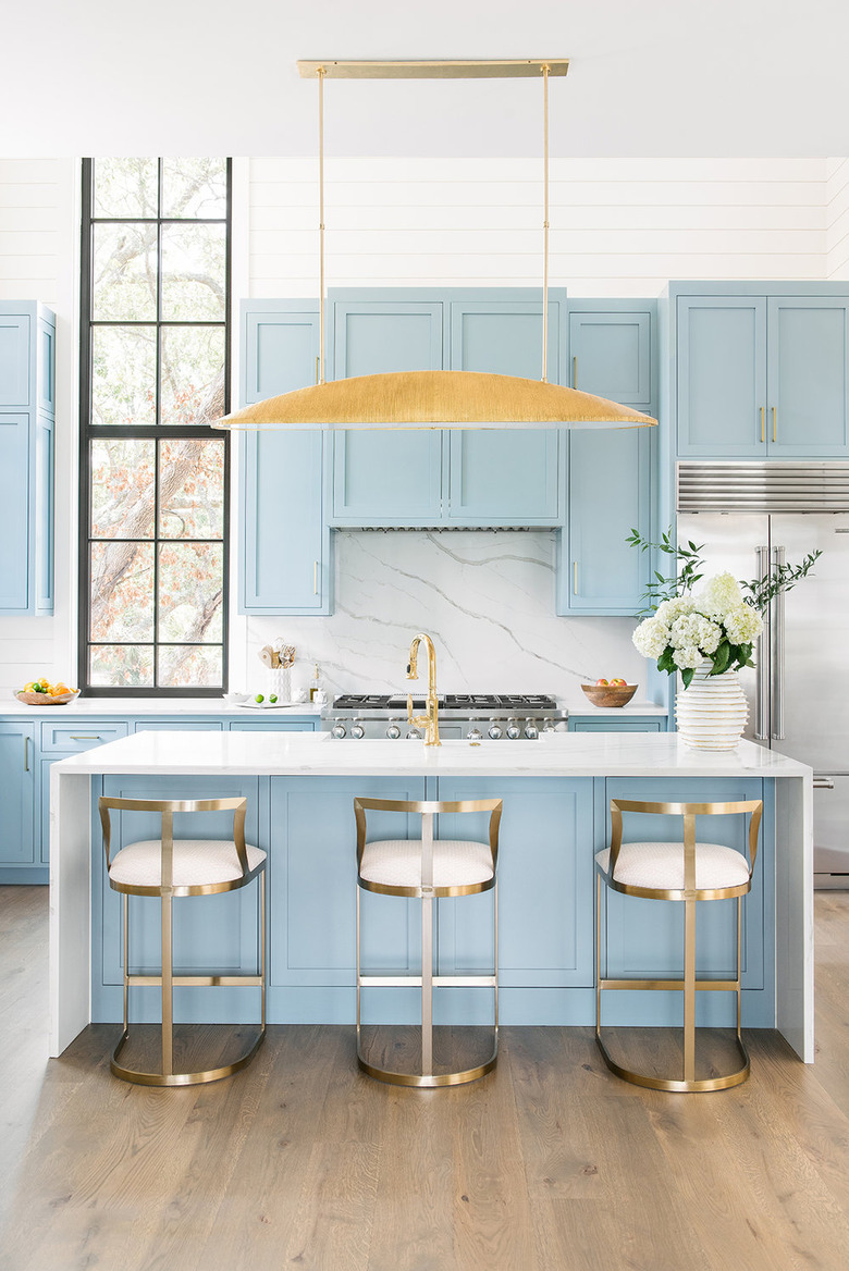 Soft sky blues are the perfect way to create a clean coastal-inspired scheme, especially when paired with bright white walls. Three Birds Renovations nailed the look in this airy design, keeping the blue kitchen island the center of attention with white cabinetry as the backdrop. Complete the look with pendant lighting and white countertops.