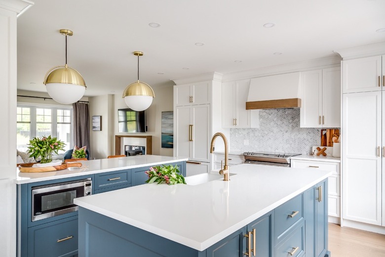 If you want your space to be truly unique, follow the lead of Hibou Design Co. and mix a custom color for your blue kitchen island. The ochre blue of this double feature is a nod to country style, with its Shaker cabinets and farmhouse sink, but the oversize brass pendants add a contemporary touch.