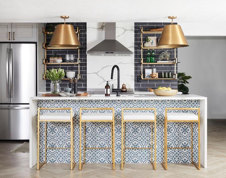 Don't want to to paint your kitchen island? Try a patterned tile instead. The blue and white motif on the back panel of this island in Cara Loren's culinary space is fitted with a white quartz waterfall countertop and finished with a sink and a matte black gooseneck faucet. We love the Mediterranean vibe of this design.