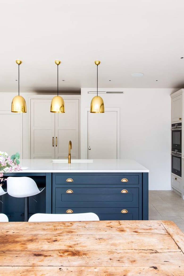 When in doubt, just add brass. Brass cabinet hardware and faucets will work particularly well with a navy blue kitchen island; see the proof in this design by Herringbone Kitchens. Make the look extra luxe by opting for brass pendant lighting, too.