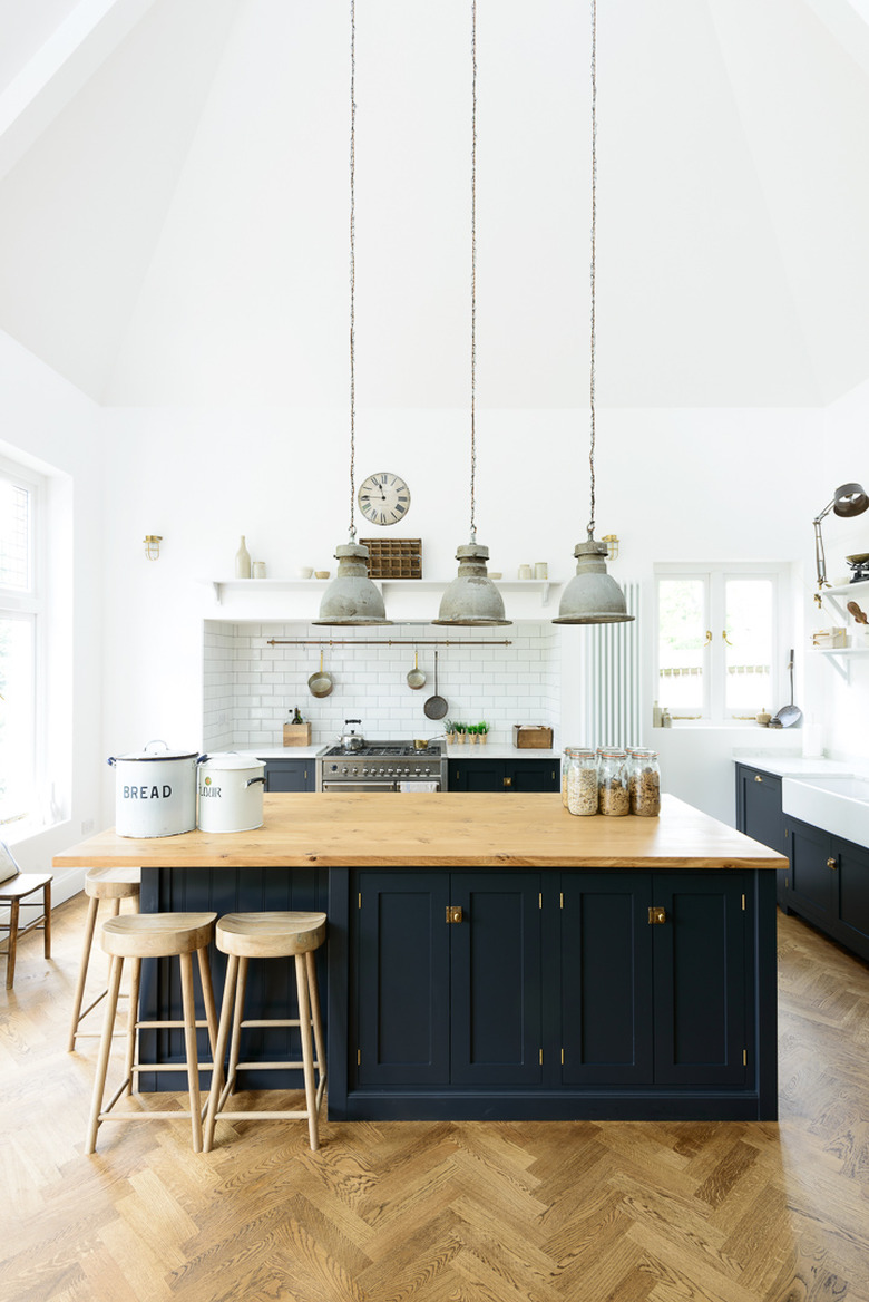 Choosing a dark navy shade for your blue kitchen island will add contrast and depth to your design, especially if you're working towards a more industrial aesthetic. DeVOL Kitchens opted for an almost black hue in this lofty cook space, perfectly accentuating the factory-style pendants and herringbone floors.