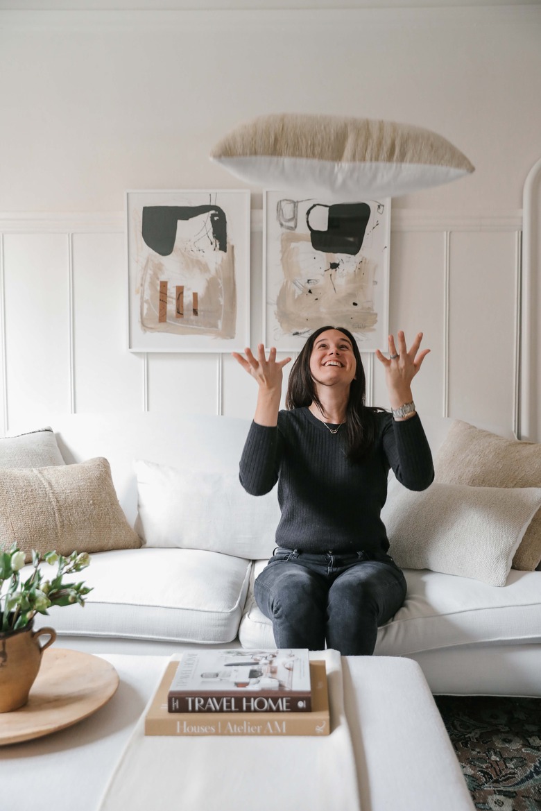 New textiles from Fragments Identity add texture and oh-so-subtle color to Flemming's existing white couch, from Serena & Lily.