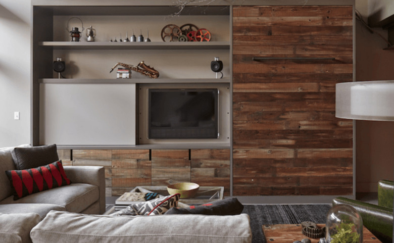 While we all love our screen time, it's nice to be able to tuck the TV away in a snap. And this shelving design from Lisa Schmitz took creative storage to the next level. A panel can slide to completely cover the screen when it's not in use. The reclaimed wood adds some rustic warmth to the room as well.