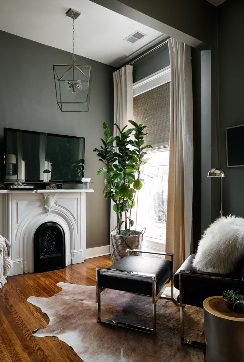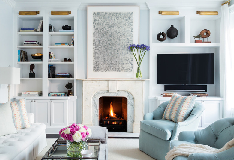 When it comes to fireplaces and big screens, they go together like peas and carrots. That's why we love this traditional style from Lisa Cotters; the television's size matches the width of the mantle perfectly. The old school lines of the of the white hearth are an awesome contrast to the TV's modernity. And those dark grey walls tie it all together.