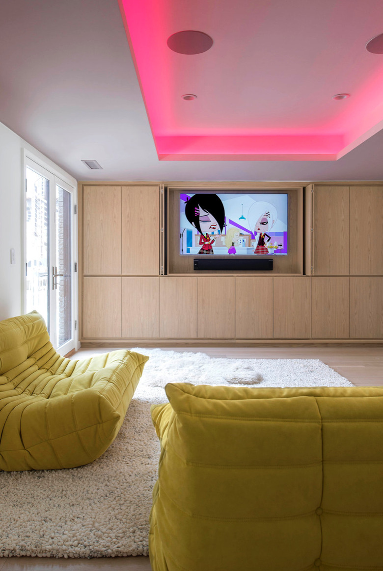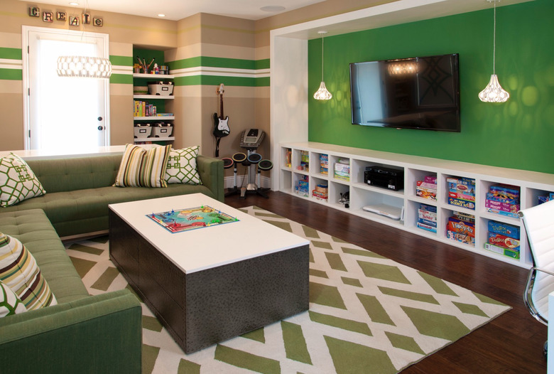We love the idea of using your family room for TV-watching and playtime. You could do both in this fun space from Robeson Design. From the built-in cubbies for toys to the glossy green wall behind the flat screen, the area combines just right the amount of function and extreme coziness.