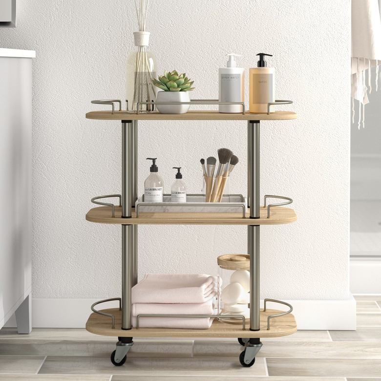 If you're short on space, add a wheeled cart to your bathroom. You can buy a utility cart specifically for this purpose, but you could just as easily repurpose an old microwave or bar cart. Putting the cart on wheels lets you tuck your toiletries out of the way when you're not using them. You can still put it front and center, however, when you do need it closer to the shower or vanity.