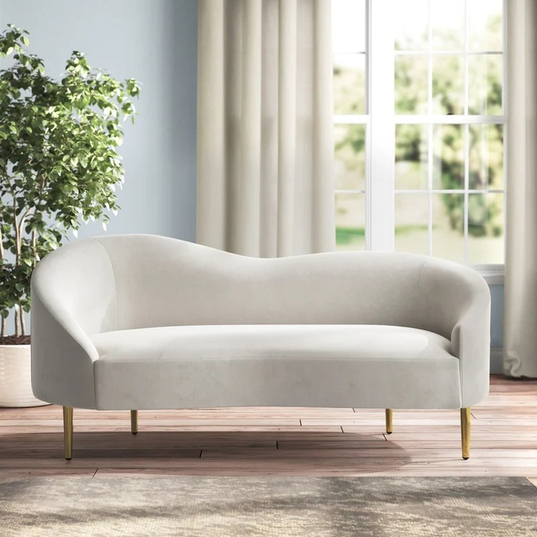 "I tend to start with the area rug when I'm decorating a room, and I was immediately drawn to this abstract rug because it has a lot of visual interest while still being very neutral. And since Leo is constantly browsing real estate listings, it seemed important to choose something that could work in a future home too. The velvet sofa in a rich, caramel hue and the walnut coffee table are also classic pieces that will look great in a variety of spaces, and I liked the juxtaposition of the clean-lined sofa arms with the soft, natural shape of the tabletop."