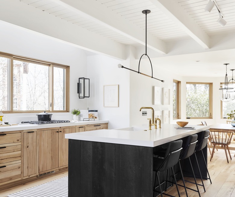 A modern and rustic kitchen island calls for sleek seating, right? Emily Henderson shows us how it's done with this tonal Scandinavian-style mountain cook space. The black leather bar chairs also complement the black island.