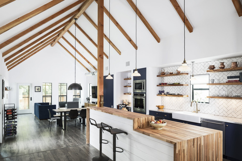 Concrete countertops can work in many types of kitchens, from farmhouse to midcentury. They're also a practical and visually interesting addition to a rustic kitchen. If you're worried about upkeep, fake it until you make it. The counter in this kitchen by Pearson Design Group is actually Caesarstone quartz in Sleek Concrete, which looks just like the real deal. A wooden ceiling, rough-hewn wooden cabinetry, and open shelving add to the overall rustic aesthetic.