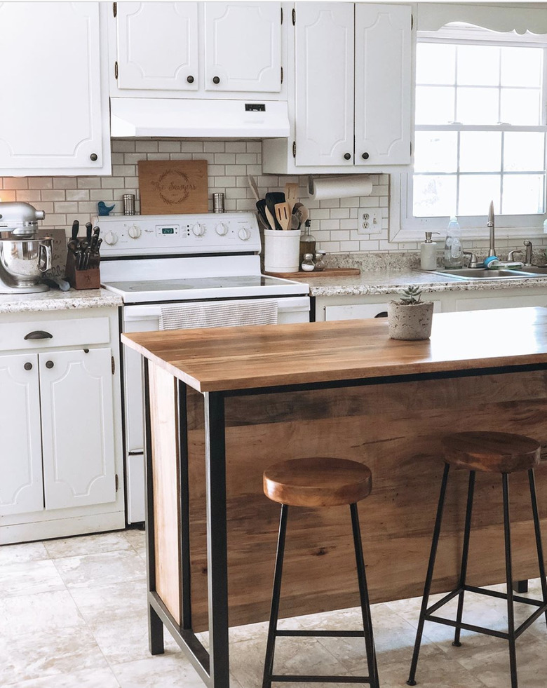 The small space kitchen island table adds a slightly rustic, industrial vibe to this North Carolina kitchen. In addition to aesthetics, though, it makes the cooking zone infinitely more functional. On one side, there's open shelving. On the other, two stools make for an impromptu workspace.
