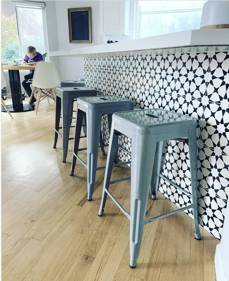 When Ally Vaughn decided to reno her kitchen, she wasn't sure about the bold island tile. She shared, "For years I wanted to brighten up our kitchen. But because there is so much natural sunlight in that space, an all-white kitchen wouldn't work. Way too bright." To solve the conundrum, she painted the lower cabinets gray and added visual interest to the island with bold tile. And the same fix can work in equally bright kitchens. You can DIY it with stick-on tile.