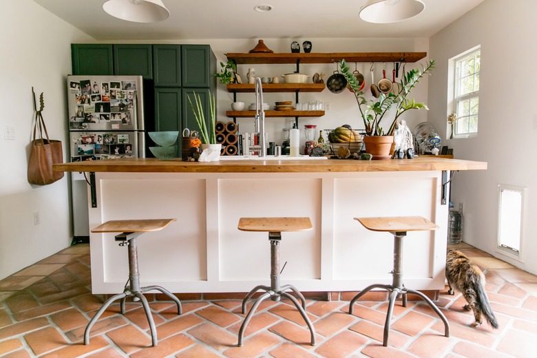 Sometimes you only need one thing to complete the look. A simple foliage clipping in a clear vase, for example, is so subtle. But it lets the other kitchen statement moments (green cabinets and gorgeous wood bar stools, we're talking about you) shine. Plus, the refined kitchen island decor gets rid of dead space.