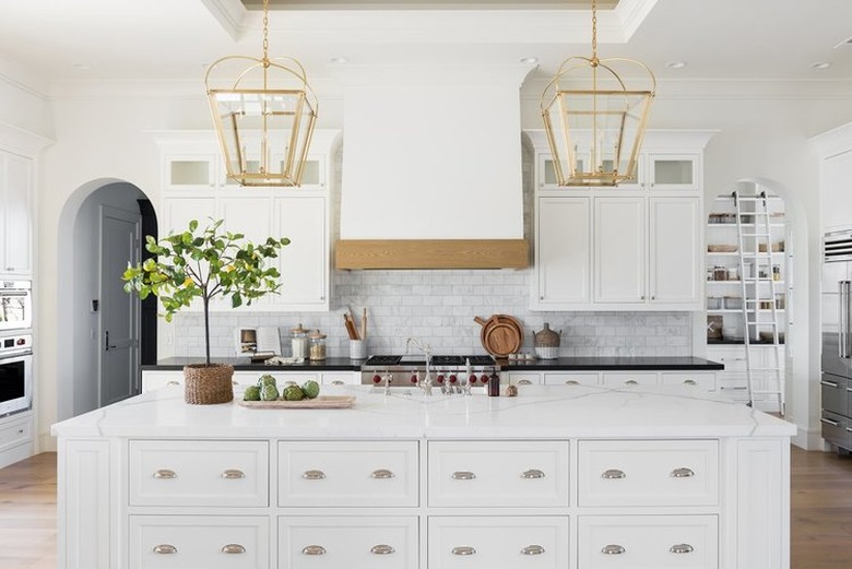 Even if you prefer to have a mostly white cooking space, you can still have fun with your kitchen island decor. Take this space from Studio McGee. A medium-sized indoor plant graces the partially marble island, and a few green veggies complete the look. You can copy this minimal kitchen style and add statement pendant lights for more interest.