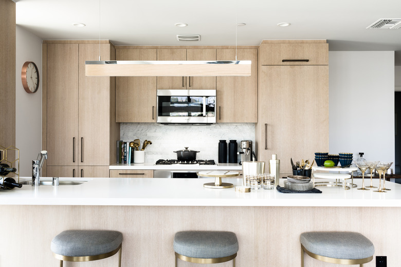 It's okay to display your kitchenware as long as it has a theme and a cohesive color palette. In this kitchen, bar accessories, glassware, and utensils stay on the island. But they all complement one another and the chic wood cabinets.