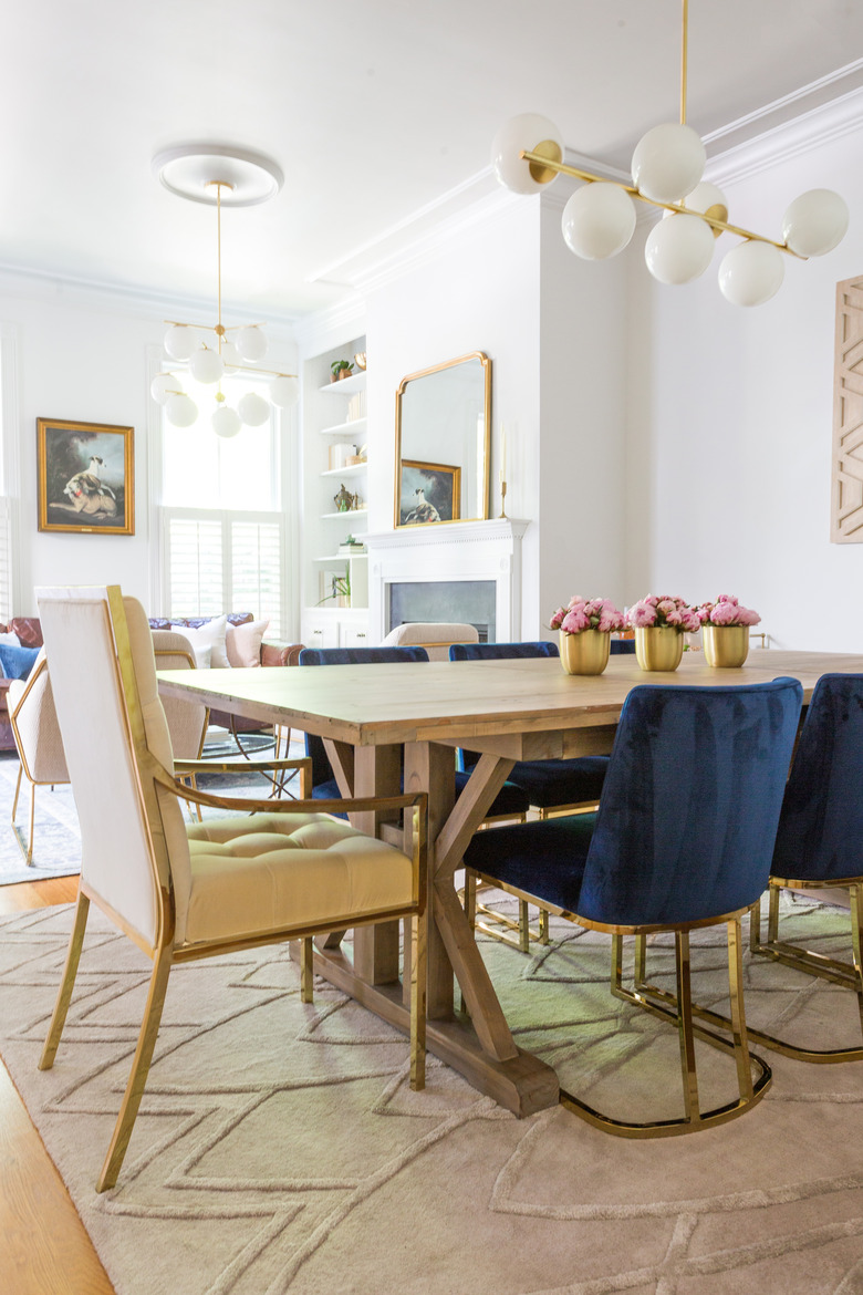 To amp up the drama in your art deco dining room, we recommend dialing down the colors and turning to dark hues. Navy blue is always a good choice as showcased on this accent wall in a space belonging to Tasha of Kaleidoscopic Living.