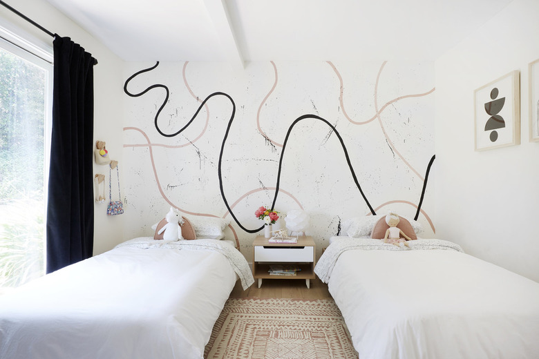 Just because it's a kids' bedroom that doesn't mean it has to be loud, overly colorful, or feel different than the rest of your home. In fact, you can create a modern, visual impact with a simple, on-trend mural, allowing it to do the talking instead of tons of decor. We especially love the contemporary, linear design seen in this space designed by Lizzie of Popix Designs.