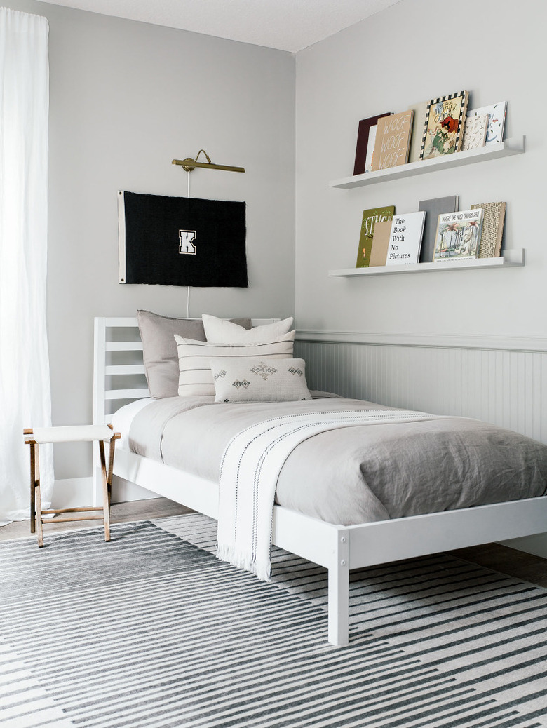 We want to remind you that a minimalist space shouldn't be devoid of personality. A kids' bedroom, even a minimalist one, should still showcase their personality, but it can be done in a way that isn't overwhelming. For example, in this serene gray refuge perfected by Justin and Chelsi of Laine and Layne, their son's beloved books and a "K" for Kenden bring in just the right amount of playful personality.