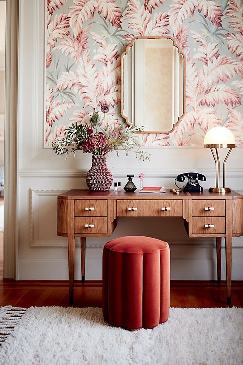 This tip is really two in one, since both mirrored accents and geometric details are key attributes of art deco design. Fuse both of these together with a geometric-shaped mirror over a bedroom vanity, hallway console table, or powder room sink.