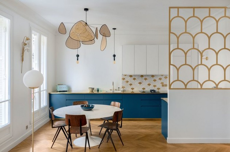 Lest you think that art deco style can only be achieved through furniture or accessories, this kitchen design by Charlotte Fequet is here to turn that theory on its head. Geometric patterns — like the white and gold backsplash featured here — instantly lend that quintessential retro vibe that's so closely associated with art deco style, and a pop of jewel-toned blue adds to the overall feminine, glamorous look.