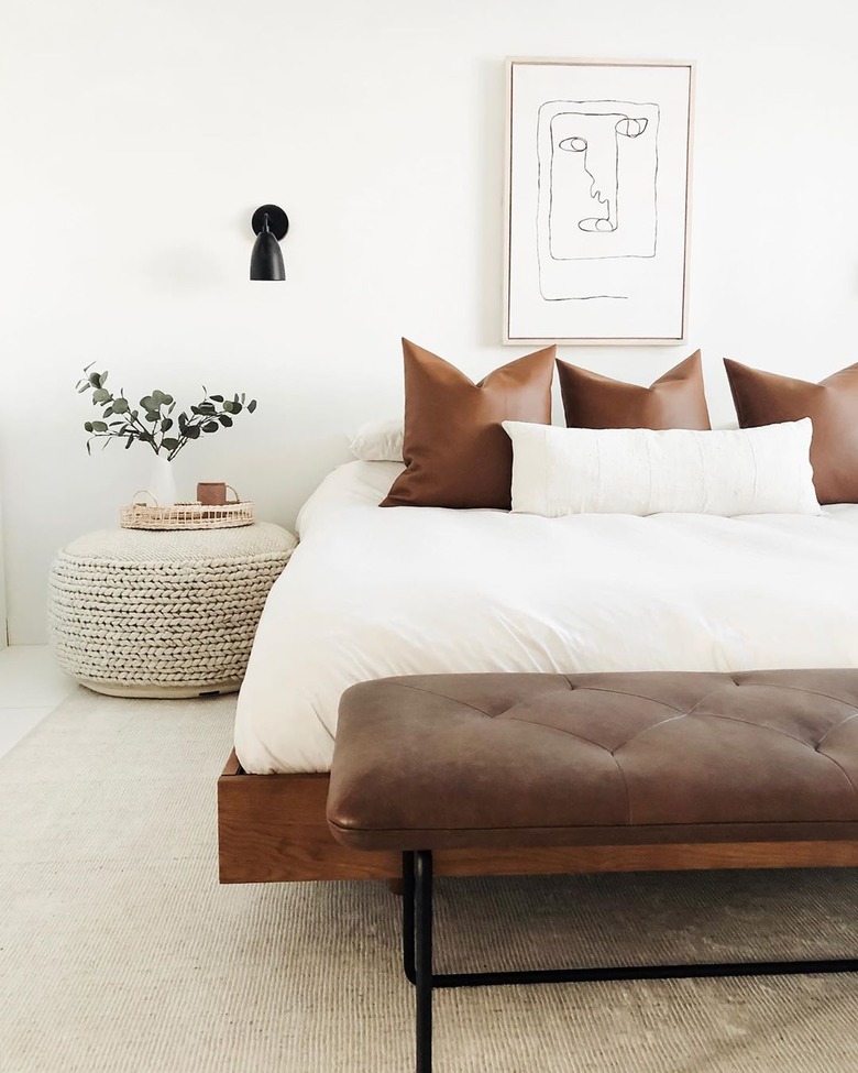 Pattern mixing is a tell-tale sign of boho style, but that doesn't mean it has to be flashy to be effective. For a more masculine take, layer subtle, tone-on-tone patterns in place of bolder options. Adding accents like woven baskets and a leather bench at the foot of the bed will complement the overall look.
