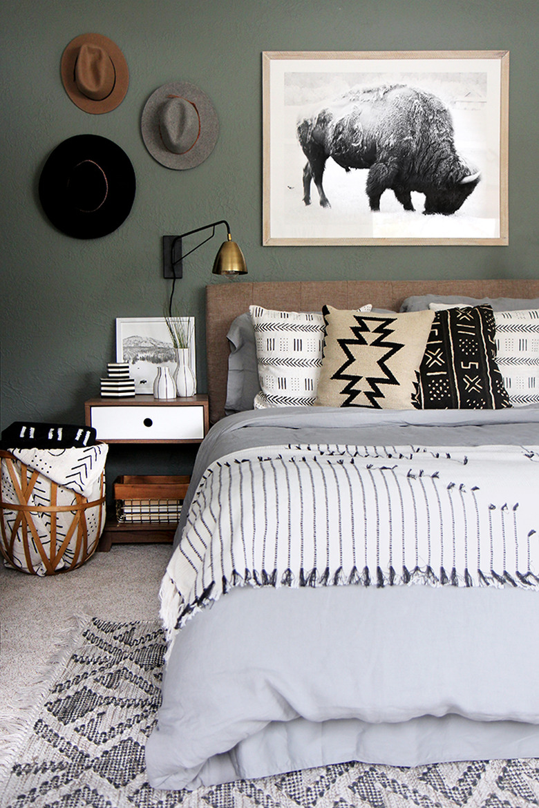We are taking notes from this masculine boho bedroom idea from I Spy DIY. The moody palette and patterned accents add visual interest and whimsical flair without feeling over the top or demanding too much attention.