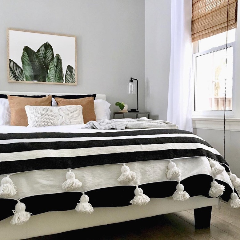 This bedroom brings in masculine boho influence in subtle details: the nature-inspired artwork over the bed, pom accents on the throw blanket, and last but certainly not least, woven window treatments. The added texture instantly balances the sophistication of the black and white bedding.