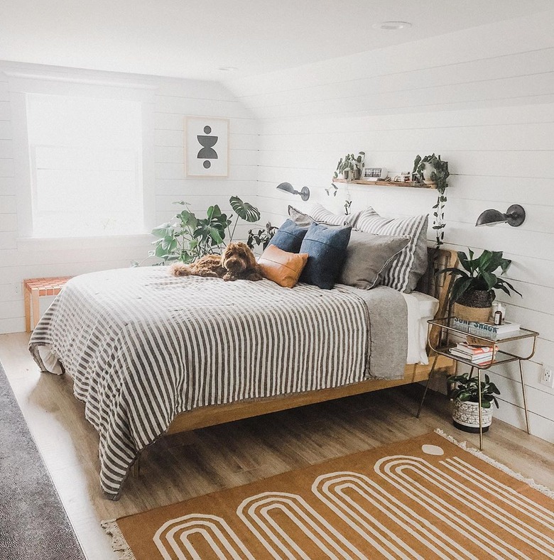 While florals can (and should!) be used in any room you choose, if they feel too feminine for your taste, try grounding your space with a neutral stripe instead. By throwing in additional botanical elements, like clusters of indoor plants, you'll still achieve a playful, inviting, boho vibe. Look no further than Amanda Jane Franz's bedroom for the ultimate inspiration.