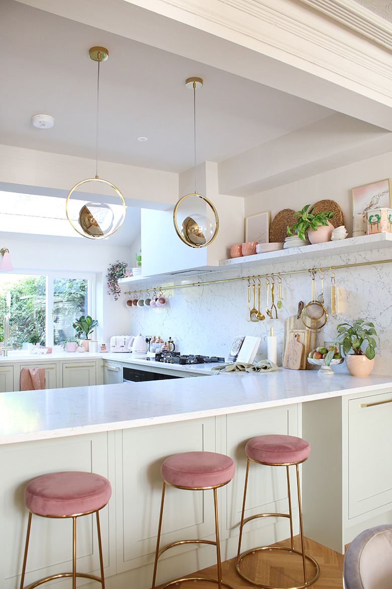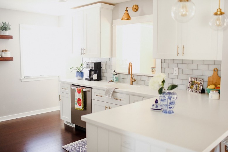 So, maybe you're drawn to solid surface countertops because you want to save some money while renovating your kitchen. That's more than OK, because you can still add luxe touches here and there to elevate the look. We recommend pairing a solid surface countertop with brass details, like lights and cabinet pulls, seen in this kitchen styled by Sarah of Bubbly & Blooms.