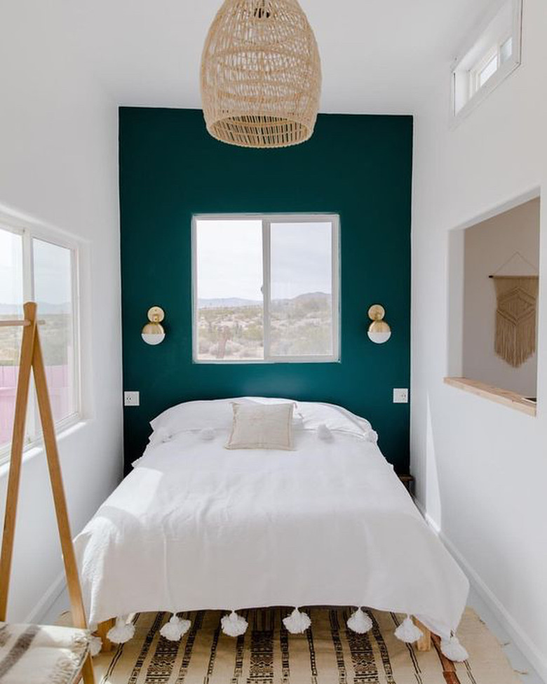Boho style tends to focus on texture, and green boho rooms are no exception. Spotted at the El Rancho Joshua Tree, a tiny bedroom makes a big statement thanks to a dramatic accent wall. But the fun doesn't stop there; the colorful focal point is paired with a rattan pendant light, tassled duvet, a fringe wall hanging, and a woven area rug to tie the look together.