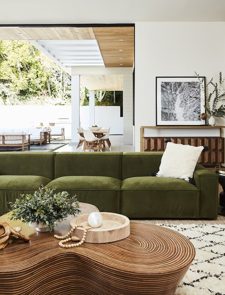 When planning out green boho rooms, we advise starting with an anchor piece and building out your decor from there. In the case of this living room belonging to actress Jenna Dewan, an olive sofa demands attention and proves that the color really should be a staple in every room of the house.