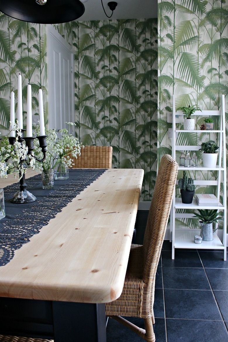 Houseplants are essential in green boho rooms, but you can always take that greenery to the walls with the help of wallpaper. In this dining space belonging to Carole of Dear Designer's Blog, the palm leaf print injects dreamy tropical flair.