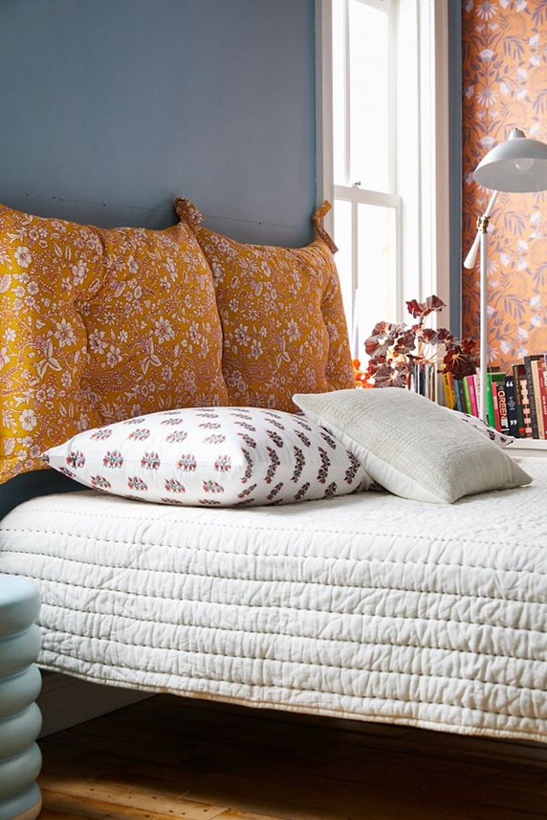 Nothing says cool and carefree like a tufted pillow that doubles as a makeshift headboard. An ideal complement to blue walls, this yellow, floral-printed piece brings a colorful touch to a textile-rich bedroom.