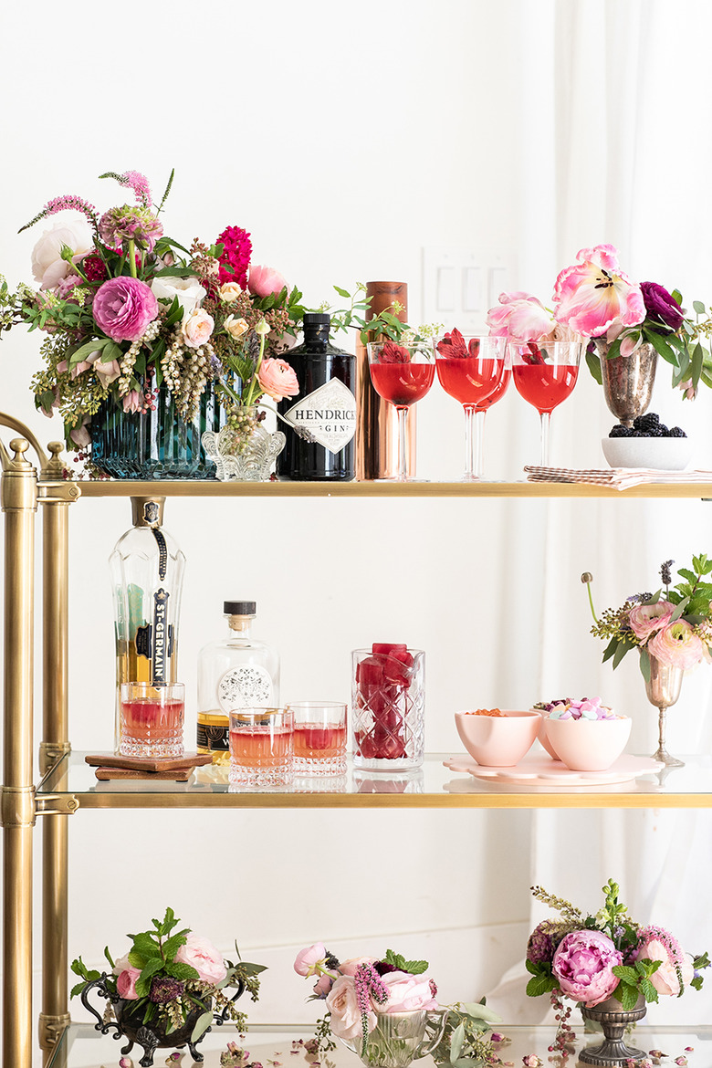 When entertaining, a fully-stocked bar cart goes without saying, and adding on some frills is always appreciated. Take a design cue from this art deco themed party idea by Sugar and Charm, and style your festive drink trolley with vintage champagne coupes and plenty of florals to boot.