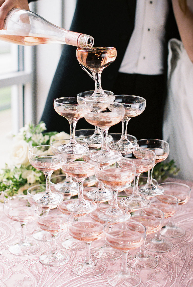 Champagne is an undisputed essential for an art deco-themed party, and presentation is everything. Swap elongated flutes in favor of compact coupes and take things to the next level by displaying it all in the form of a glass pyramid tower, like this setup captured by Jessica Gabeler.