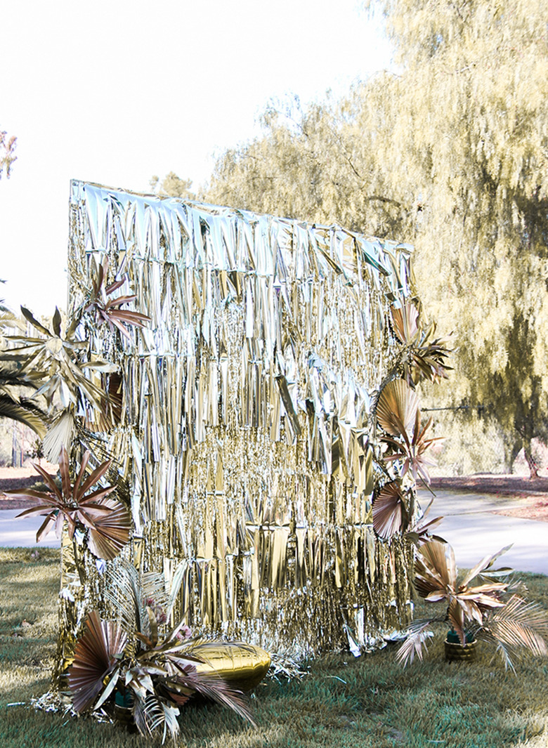 Make your bash as memorable as ever with a photo booth background that's glam to the max. Line a blank wall with strips of gold tinsel — tassel and fringe garlands work as well — and supply guests with cheeky accessories and props. This oversize backdrop, spotted on Inspired By This, ups the ante with spray-painted palms and fronds.
