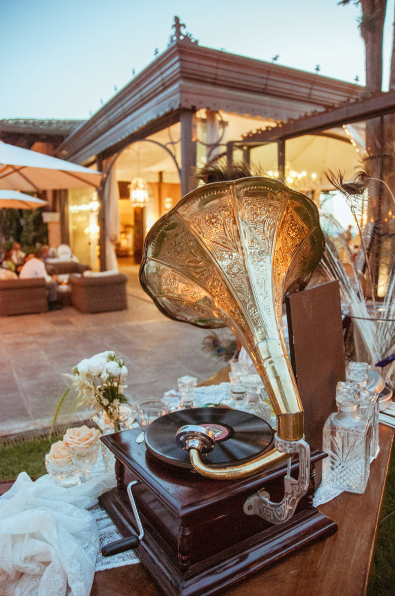Vintage accents reminiscent of the era are a must-have for a thematic focal point. Use a stylish yet functional object like this antique phonograph, spotted at a wedding featured on Style Me Pretty, to double as the anchor for a tablescape. Weave in fresh blooms along the sides for a fragrant touch. Complete the scene with secondhand glassware and linens for a look that's bursting with art deco flair.