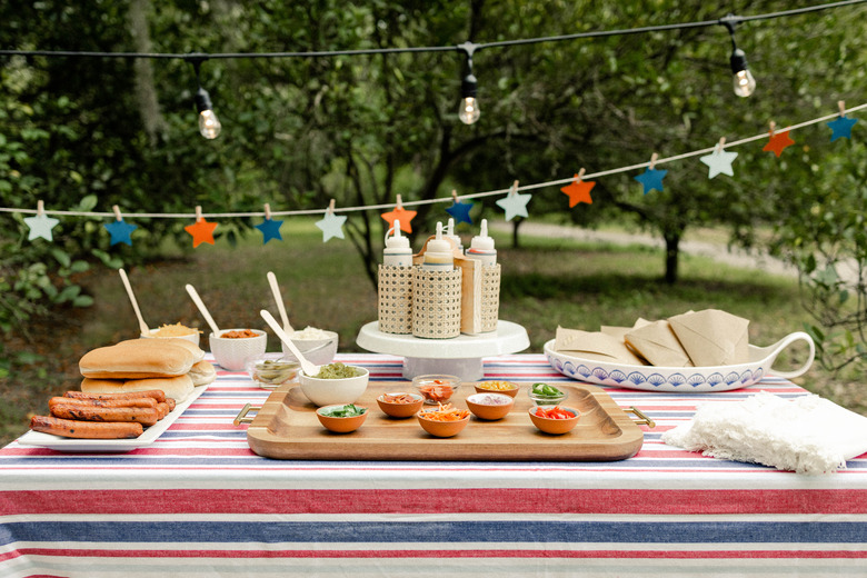 As the temperatures swell and daylight hours expand, so do the opportunities to escape from the indoors and head to your backyard or patio to fire up the grill. What better way to welcome the warmer days than with an all-American hot dog bar? We've elevated a simple family dinner into a choose-your-own adventure meal with an epicurean twist. A variety of classic and gourmet toppings arranged in a self-serve style buffet is sure to satisfy everyone's tastes, while a DIY condiment caddy pulls double-duty as a festive centerpiece and convenient sauce organizer. Easy, breezy, and oh-so-memorable for kids and adults alike!