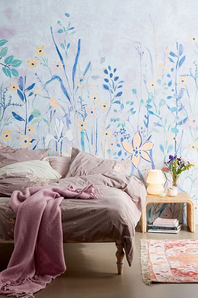 When all else fails, you can always depend on a colorful wall mural to make a boho statement in a bedroom. This stylized flowering wall mural goes on in seconds and will quickly energize any space.